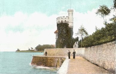 Apley Tower, Ryde.-Within one and a half miles of Ryde the wall is a continuation of the Esplanade in the direction of Spring Vale and Sea View. The wall furnishes a means of defence against the encroachment of the sea, as well as a thoroughfare for pedestrian traffic. Bicycles are also used on it to some extent. When the tide is out a wide stretch of sands is exposed, and crowds of children use it as a pleasure ground, finding beautiful seaweed and shells. The walk can be continued round the further point into Sea View. |