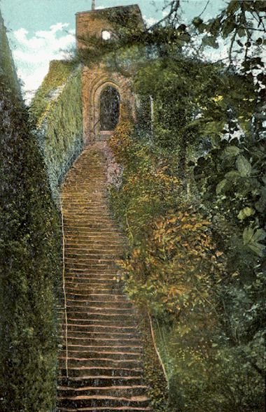 Steps To The Keep, Carisbrooke Castle.-As a memorial of a bygone age how interesting are the steps to the keep, the last resort of the besieged, from which it would be difficult to dislodge them, without great loss. The well which furnished them with water is now dry, but can still be seen. The battlements furnish the visitor with a magnificent view of the country in every direction. The steps, seventy-two in number, are somewhat steep. The walls are covered with climbing plants. Shelter is afforded by trees and bushes, while access is given at the back of the ancient buildings in the Castle, to facilitate escape in case of surprise. |