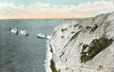 The Needles.-When walking on the Downs from freshwater to the Needles, following the path by the military fence, this picture of the Needles comes suddenly into view, and is a very impressive sight. The Needles themselves are stacks of upper chalk, with flints, and are the remains of an extension of the chalk. The cliffs here are about four hundred feet in height, and at their base the sea breaks frequently in a long surf line on the steep shingly shore. In calm weather visitors engage boatmen at Totland and Alum Bays to take them in boats through the Needles and land them in Scratchels Bay. |
