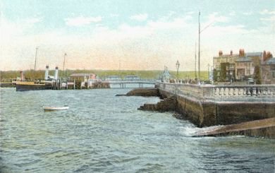 The Pier, Cowes.-The new Pier and Esplanade from an attractive feature at Cowes. When emerging from its narrow streets you come out into the wide open expanse of Esplanade, it is a great relief. The Marine Hotel forms a prominent object. East Cowes is to be seen in the distance. This view is taken from close to the entrance to the Royal Yacht Squadron Grounds and Landing Stage. |
