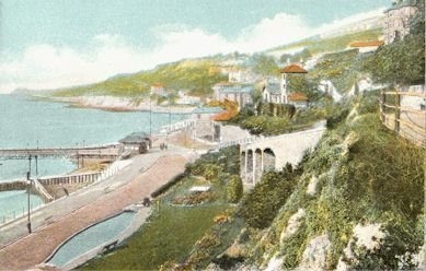 Ventnor, Looking West.-From this point Ventnor is beautiful both in summer and in winter. The setting sun on a winter day is a sight worth travelling far to see, and in summer the white chalk cliffs of the foreground are clothed with crimson valerian, mingled with bright green samphire, while the gardens below, with the miniature lake, are full of colour. These effects, together with the houses perched on every conceivable vantage point of rock and surrounded with vegetation of varied hue, make up a picture of entrancing beauty. There is a good Pier for promenading and fishing as well as for steamboat excursions. |
